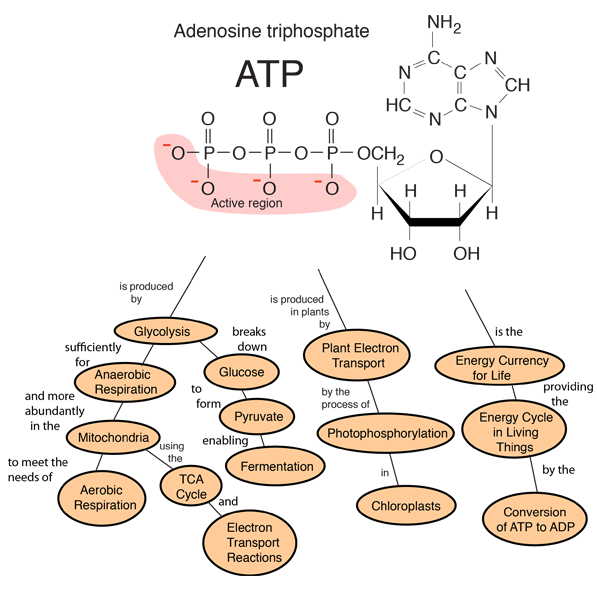 Living things can use ATP like a battery. The ATP can power needed reactions by losing one of its phosphorous groups to form ADP, but you can use food energy in the mitochondria to convert the ADP back to ATP so that the energy is again available to do needed work. In plants, sunlight energy can be used to convert the less active compound back to the highly energetic form. For animals, you use the energy from your high energy storage molecules to do what you need to do to keep yourself alive, and then you “recharge” them to put them back in the high energy state. The oxidation of glucose operates in a cycle called the TCA cycle or Krebs cycle in eukaryotic cells to provide energy for the conversion of ADP to ATP.