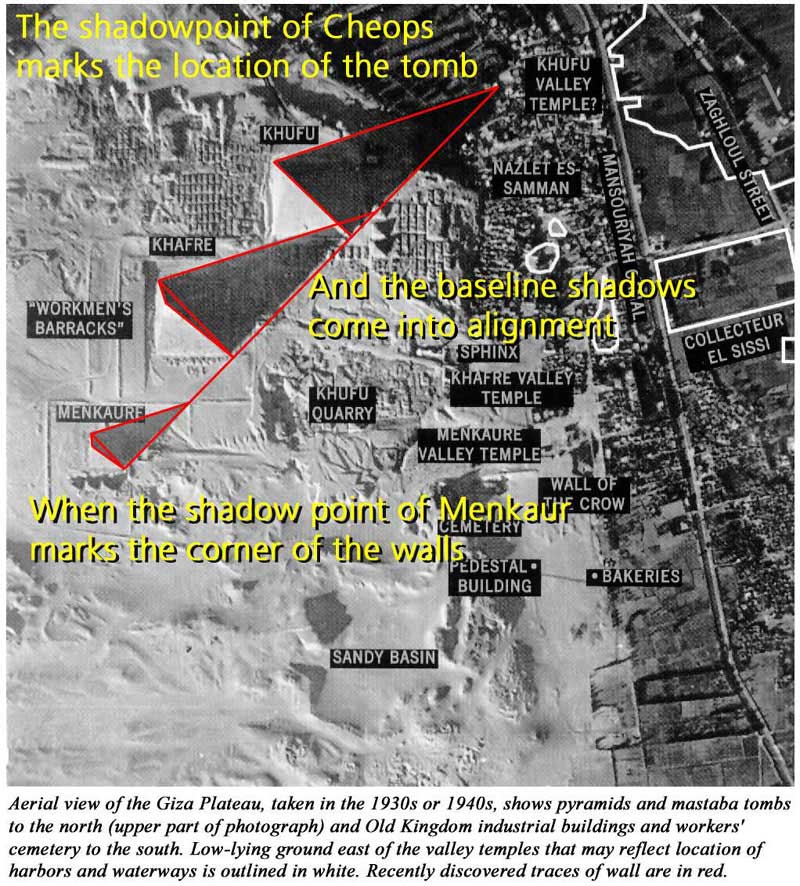 It is completely within the realm of rationality to postulate that the Great Pyramids had been completed long before the reign of Khufu ( Cheops,) and that the Khufu Valley Temple, and possibly his tomb, was located at the shadow tip of the pyramid that now bears his name. At that time, only the priests would have been aware of the aligning phenomena which only occurred once a year. It is an auspicious location. That would make the Khufu Valley Temple as identified in the photo part and parcel of the phenomena occurring on the shortest day of the year. ( A day celebrated into modern times by various religious groups.)
