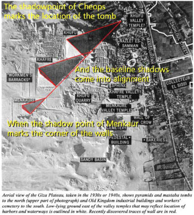 With the sun at its lowest point on the southwestern horizon the first important note is struck by the shadow of the Great Pyramid attributed to the Pharaoh Menkaur. The tip of the shadow is in perfect synchronicity with the corner of an ancient temple courtyard. In its effect, the pyramid is acting like a sundial except its face is square rather than round. Once again, the architecture at Giza serves to square the circle. The shadow also completes a 3-4-5 right triangle. This alignment marks the winter solstice. As can readily be seen, at the same moment the shadow of Menkaur reaches the solstice point, the shadow lines of all three great pyramids fall into perfect alignment. This phenomena is of obvious intent.