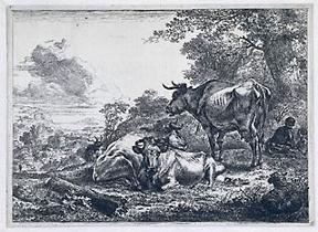 Perhaps this was a landscape Nicolaes Berchem had seen in Italy. Even so, the picture was not drawn directly from nature. He borrowed two of the cows from a print made by Paulus Potter in 1643. Potter, who specialised in depicting animals, placed his cows in a typically Dutch landscape, while Berchem preferred a more southerly countryside.