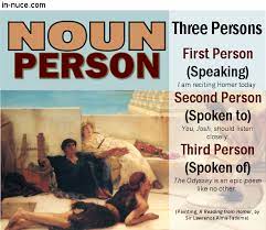 Each person in grammar represents a different perspective or point of view (POV) in a narrative. First person includes the speaker (English: I, we, me, and us), second person is the person or people spoken to (English: you), and third person includes all that are not listed above (English: he, she, it, they, him, her, them, the people). It also frequently affects verbs, and sometimes nouns or possessive relationships.